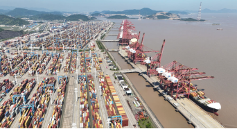 貨輪停靠在寧波舟山港穿山港區(qū)裝卸貨物(2023年5月9日攝,無人機照片)。新華社記者翁忻旸 攝