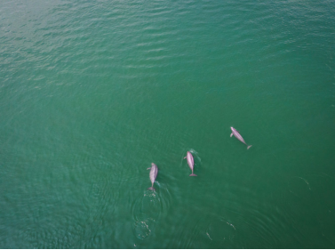 這是2021年5月11日在湖北省宜昌市拍攝的在水中嬉戲的長江江豚(無人機照片)。新華社記者 肖藝九 攝
