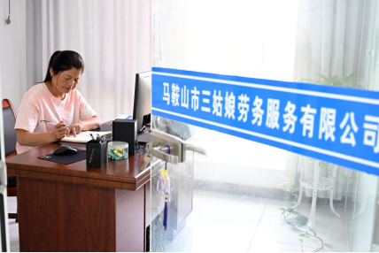 安徽省馬鞍山市薛家洼的上岸漁民陳蘭香在馬鞍山市三姑娘勞務(wù)服務(wù)有限公司辦公(2023年7月24日攝)。新華社記者 周牧 攝