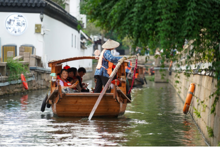 游客乘船在蘇州平江歷史文化街區(qū)休閑游玩(2023年7月3日攝)。新華社記者 李博 攝