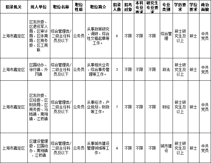 嘉定區(qū)面向國(guó)內(nèi)部分高校招錄碩士研究生及以上學(xué)歷的應(yīng)屆大學(xué)畢業(yè)生,為嘉定現(xiàn)代化新型城市、世界級(jí)汽車產(chǎn)業(yè)中心核心承載區(qū)、上??苿?chuàng)中心重要承載區(qū)建設(shè)厚植人才優(yōu)勢(shì),提供源源不斷的黨政人才支撐。