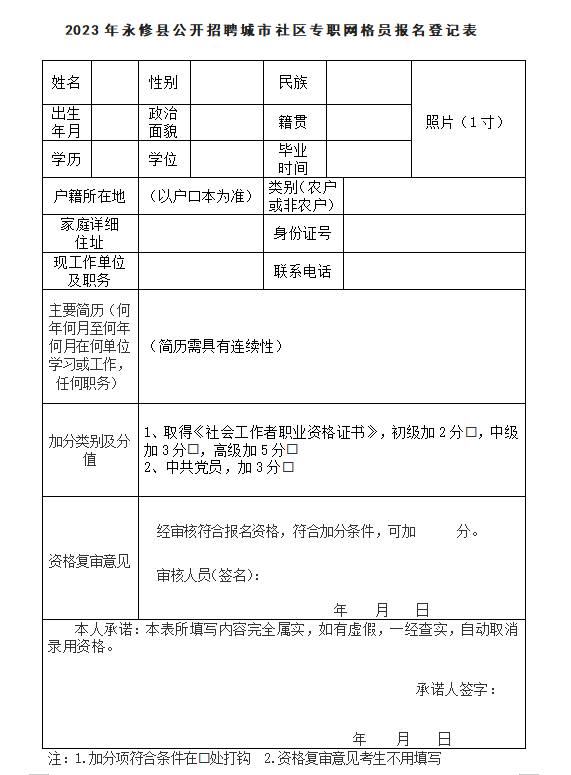 附件:永修縣2023年公開選聘城市社區(qū)專職網(wǎng)格員報(bào)名登記表