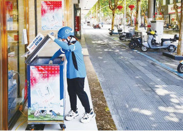 2023年8月7日,一名外賣員在浙江省桐鄉(xiāng)市街頭的“愛心冰柜”取水。在桐鄉(xiāng)市,“一杯水”公益接力已持續(xù)5年,越來越多的商家、市民踴躍加入,為戶外工作者送去愛心。桐鄉(xiāng)市委宣傳部供圖