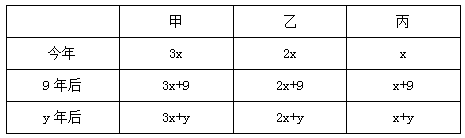 根據(jù)“9年后甲的年齡是丙的2.4倍”,可列式為3x+9=2.4×(x+9),解得x=21;再根據(jù)“y年后丙的年齡是乙的