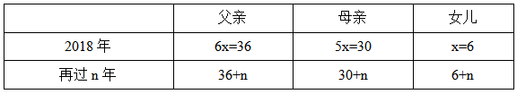 已知女兒出生當(dāng)年(按0歲計(jì)算)母親24歲,即母親比女兒大24歲,有5x-x=24,解得x=6,故可得2018年三人年齡并填在表中。再過n年,父母年齡之和是女兒的4倍,有36+30+2n=4×(6+n),解得n=21,所以在2018+21=2039年父母年齡之和是女兒的4倍。故選B。