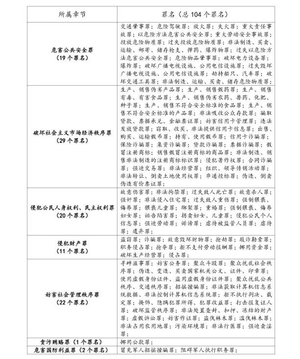 雖然我國法律并沒有對刑事諒解適用的案件范圍作出限制,但一般來說,需要有被害人的案件才可以出具刑事諒解書。經(jīng)檢索刑事裁判文書,大約有104個罪名可以出具刑事諒解書。如下表所示:
