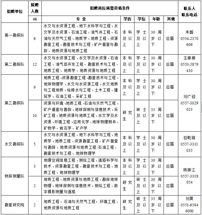 安徽省煤田地質(zhì)局歡迎莘莘學(xué)子咨詢報(bào)名,簡(jiǎn)歷請(qǐng)投至專用郵箱ahsmtdzjxyzp@163.com。郵箱所收簡(jiǎn)歷,由局勞資教育處專人負(fù)責(zé)收集整理并分發(fā)各招聘單位。各招聘單位定期邀請(qǐng)有意向的學(xué)生到單位參觀交流(單位統(tǒng)一安排食宿),雙方協(xié)商一致后面試、簽約。各單位招聘專員聯(lián)系方式如下: