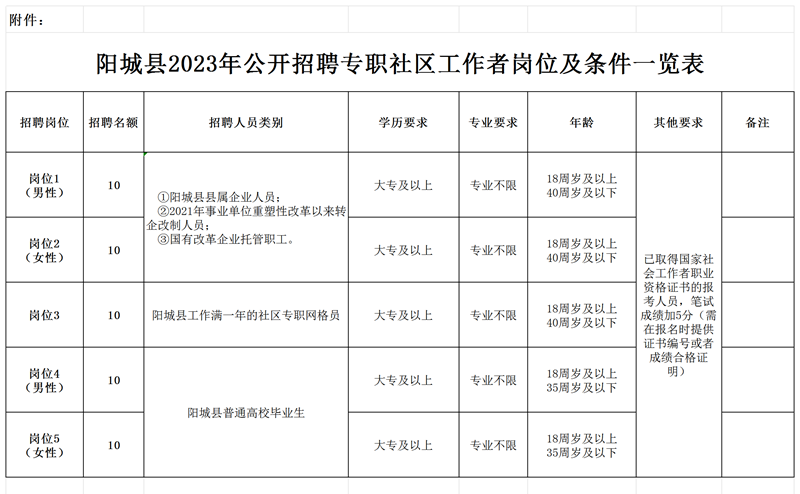 附件:《陽(yáng)城縣2023年公開(kāi)招聘專職社區(qū)工作者崗位及條件一覽表》??
