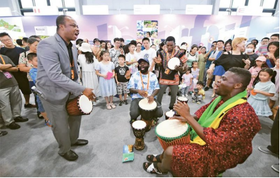 2023年中國(guó)國(guó)際服務(wù)貿(mào)易交易會(huì)上舉辦“一帶一路”共建國(guó)家特色文化展示活動(dòng),通過特色文藝演出、文化推介、護(hù)照打卡等一系列活動(dòng),展現(xiàn)共建國(guó)家文化風(fēng)采。圖為展示活動(dòng)上,加納共和國(guó)駐華大使館展區(qū)的工作人員在現(xiàn)場(chǎng)即興表演。新華社記者鞠煥宗/攝
