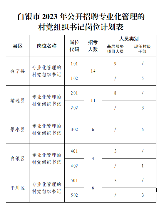 針對(duì)各縣區(qū)專業(yè)化管理的村黨組織書記崗位空缺情況,從鄉(xiāng)鎮(zhèn)機(jī)關(guān)在崗未入編項(xiàng)目人員和現(xiàn)任村級(jí)干部中,公開招聘專業(yè)化管理的村黨組織書記41人,其中:會(huì)寧縣14人、靖遠(yuǎn)縣11人、景泰縣6人、白銀區(qū)4人、平川區(qū)6人。