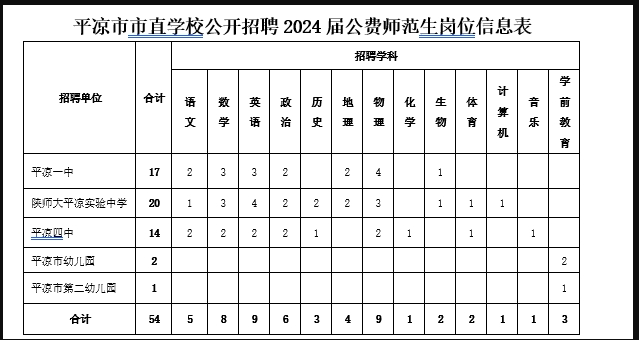 本次計劃招聘54名,其中平?jīng)鲆恢?7名、陜師大平?jīng)鰧嶒炛袑W(xué)20名、平?jīng)鏊闹?4名、平?jīng)鍪杏變簣@2名、平?jīng)鍪械诙變簣@1名。招聘崗位信息見下表。