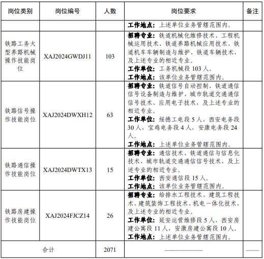 本次計(jì)劃招聘2071人,招聘崗位均為鐵路運(yùn)輸生產(chǎn)一線操作技能崗位。招聘崗位、專業(yè)、工作地點(diǎn)及人數(shù)等內(nèi)容詳見附件。