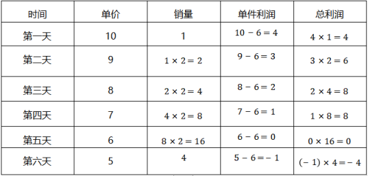 賦值該商品的原價(jià)為10元,第一天的銷量為1件。根據(jù)題意,每天單價(jià)下降10*10%=1元;每天的銷量變?yōu)榍耙惶斓?倍;“成本為原價(jià)的60%”,則每件的成本為10*60%=6元。根據(jù)題意可得表格如下: