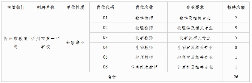 按照事業(yè)單位公開招聘工作人員有關文件規(guī)定,根據(jù)增人計劃和招聘單位編制、崗位空缺及教師隊伍結(jié)構(gòu)情況,經(jīng)市委、市政府同意,通過校園招聘方式,面向全國本科院校2024年本科及以上學歷學位應屆畢業(yè)生(含公費師范生,不含定向及委培生),為忻州市第一中學校招聘教師26名,現(xiàn)公告如下: