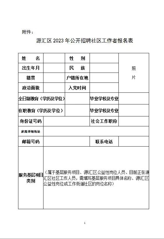附件:源匯區(qū)2023年公開招聘社區(qū)工作者報名表