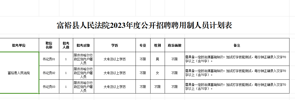 (八)限齊齊哈爾行政區(qū)劃內(nèi)戶(hù)籍人員報(bào)考(詳見(jiàn)附件1:《富裕法院2023年公開(kāi)招聘聘用制人員計(jì)劃表》)。