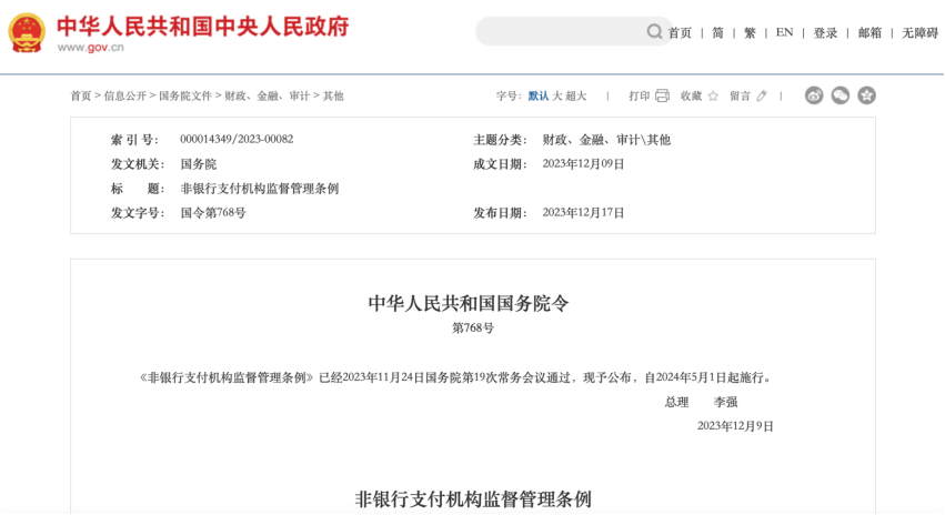 《非銀行支付機(jī)構(gòu)監(jiān)督管理?xiàng)l例》于12月17日正式公布自2024年5月1日起施行。
