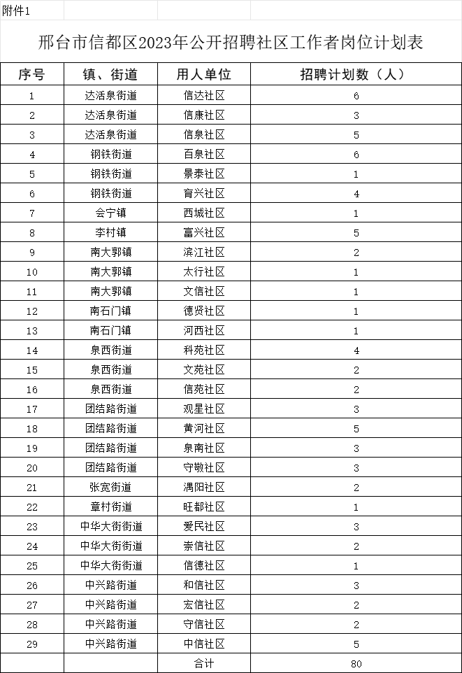 公開(kāi)招聘社區(qū)工作者共80名,具體崗位計(jì)劃詳見(jiàn)《邢臺(tái)市信都區(qū)2023年公開(kāi)招聘社區(qū)工作者崗位計(jì)劃表》(附件1)。