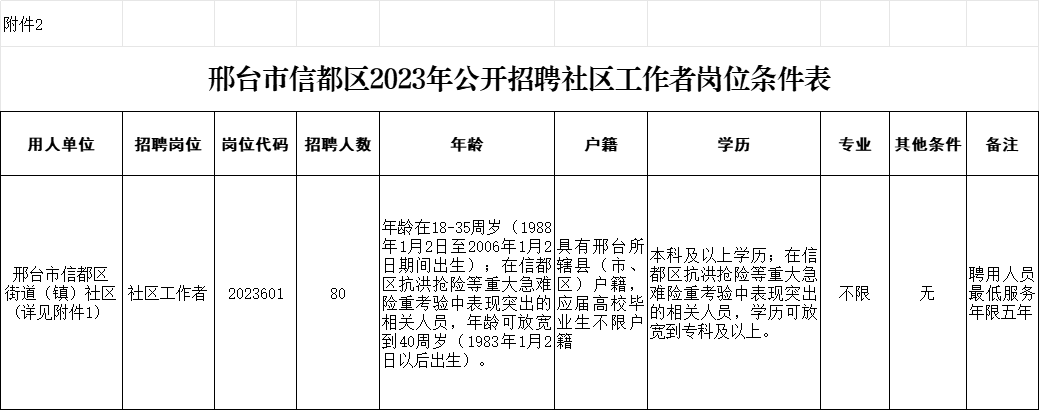 2.《邢臺(tái)市信都區(qū)2023年公開(kāi)招聘社區(qū)工作者崗位條件表》