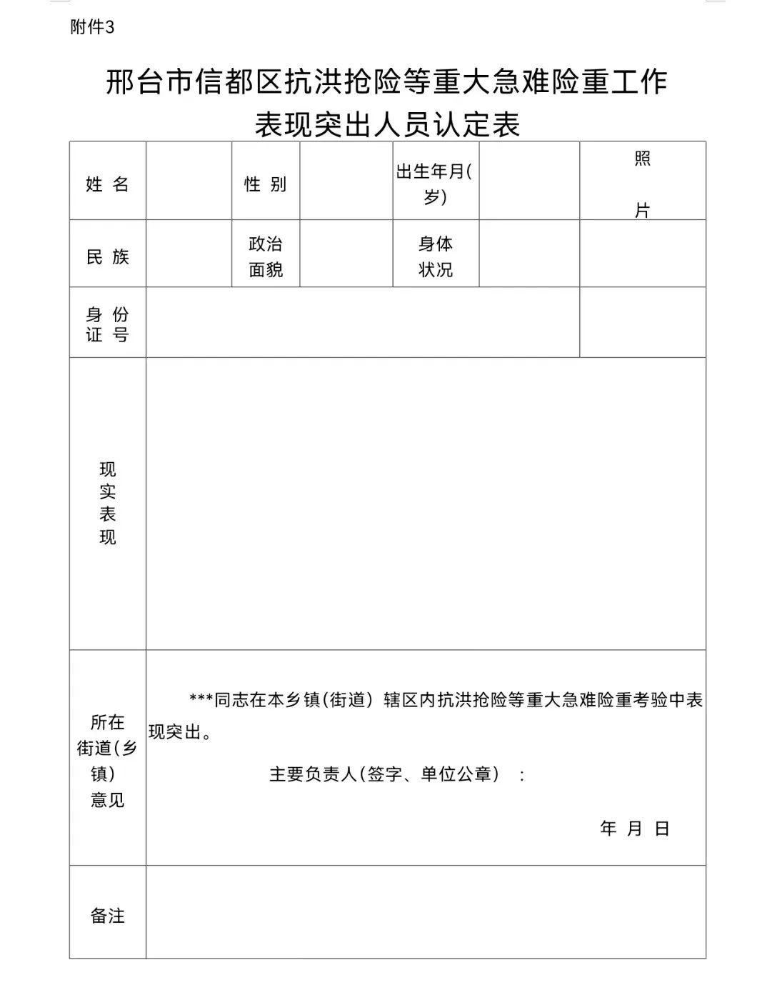 3.《邢臺(tái)市信都區(qū)抗洪搶險(xiǎn)等重大急難險(xiǎn)重工作表現(xiàn)突出人員認(rèn)定表》