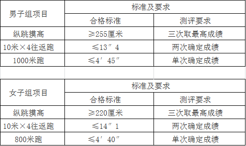 體能測(cè)評(píng)為達(dá)標(biāo)性測(cè)評(píng),凡其中一項(xiàng)不達(dá)標(biāo)的,視為體能測(cè)評(píng)不合格。體能測(cè)評(píng)3個(gè)項(xiàng)目全部合格的考生,發(fā)給《體能測(cè)評(píng)合格證》。