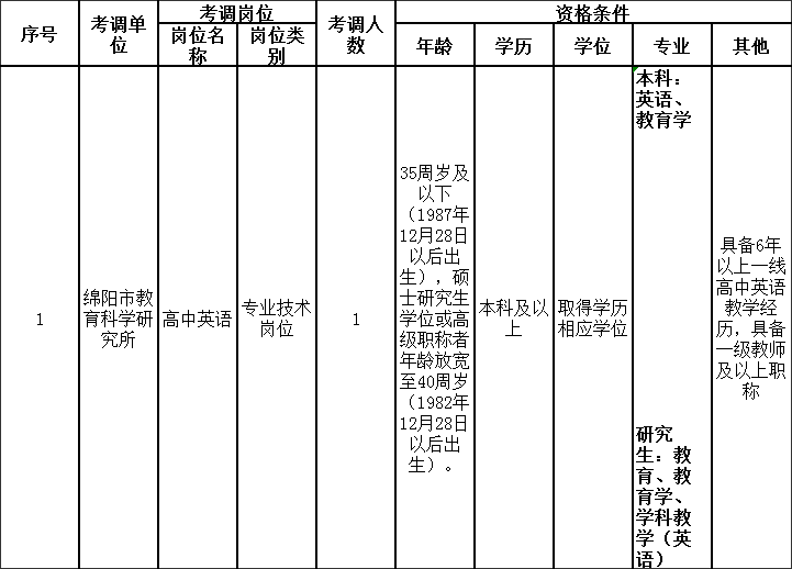 考調(diào)名額1名,招聘對象為符合本公告和《綿陽市教育科學(xué)研究所公開考調(diào)專業(yè)技術(shù)人員崗位和條件一覽表》(附件1)所載條件要求的人員。