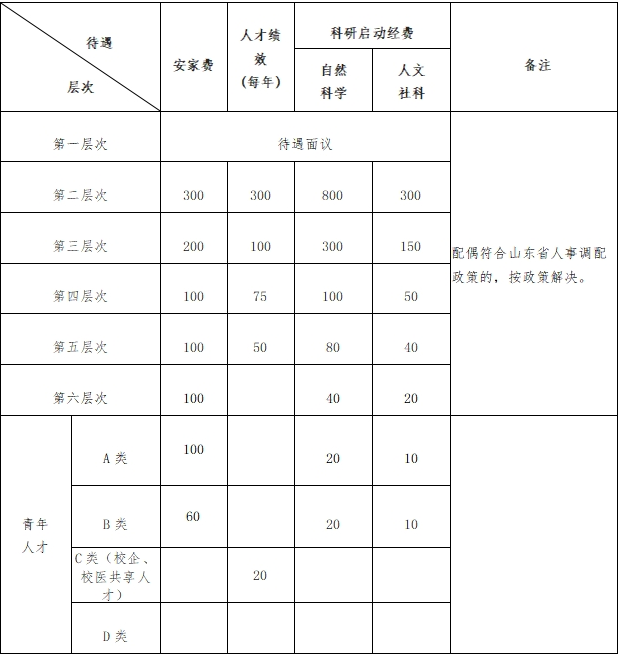 ?。ㄒ唬└黝愐M(jìn)人才除享受國(guó)家及學(xué)校規(guī)定的基本工資待遇外,學(xué)校在安家費(fèi)、科研啟動(dòng)經(jīng)費(fèi)等方面提供以下待遇。(人民幣,單位:萬元)