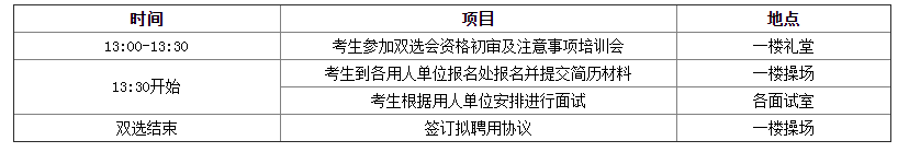 應(yīng)聘人員需在上述時間內(nèi)攜帶應(yīng)聘材料至雙選會會場參加公開招聘,未到場者視為自動放棄招聘資格,具體安排如下: