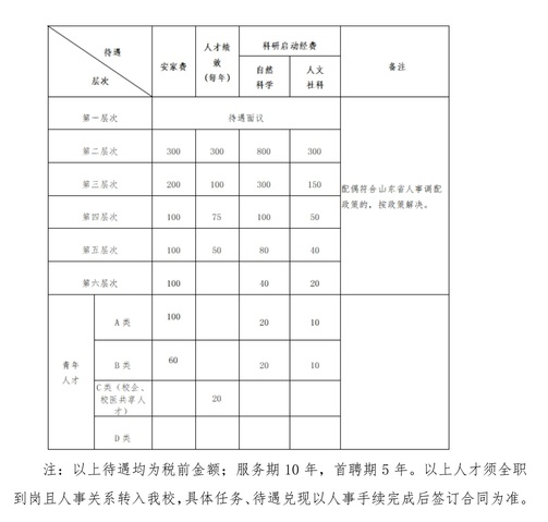 ?。ㄒ唬└黝愐M人才除享受國家及學校規(guī)定的基本工資待遇外,學校在安家費、科研啟動經(jīng)費等方面提供以下待遇。(人民幣,單位:萬元)