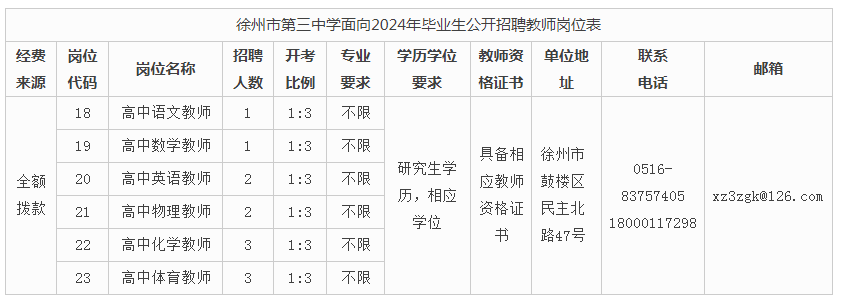 《徐州市第三中學(xué)面向2024年畢業(yè)生公開招聘教師公告》在徐州市人力資源和社會(huì)保障局網(wǎng)站(http://hrss.xz.gov.cn)、徐州市教育局網(wǎng)站(http://jyj.xz.gov.cn)、徐州市第三中學(xué)網(wǎng)站(http://www.xz3z.com)發(fā)布,具體的崗位名稱、招聘人數(shù)、資格條件等詳見下表。