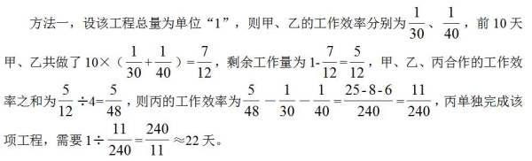 方法二,設該工程總量為120(30和40的最小公倍數(shù)),則甲、乙的工作效率分別為4、3。前10天甲、乙共做了10×(4+3)=70,剩余工作量為120-70=50,甲、乙、丙合作的工作效率之和為50÷4=12.5,則丙的工作效率為12.5-7=5.5,丙單獨完成該項工程,需要120÷5.5≈22天。故本題選B。