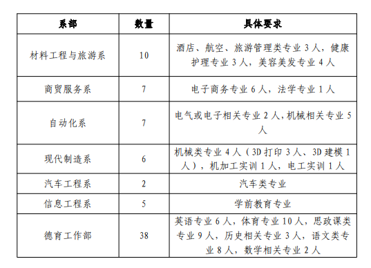 根據(jù)學(xué)院教學(xué)工作需要,各系部擬招聘公共課、專業(yè)課外聘教師共75人,具體招聘崗位和數(shù)量見如下表格: