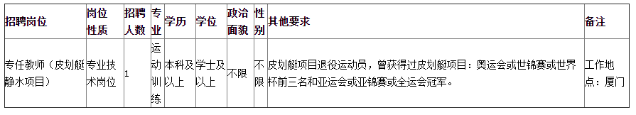 福建體育職業(yè)技術(shù)學(xué)院因工作需要,擬面向具有突出貢獻的退役運動員公開招聘教師1名。根據(jù)《事業(yè)單位公開招聘工作人員暫行規(guī)定》和《福建省省屬事業(yè)單位公開招聘工作人員考試暫行辦法》等有關(guān)規(guī)定,制定具體方案如下: