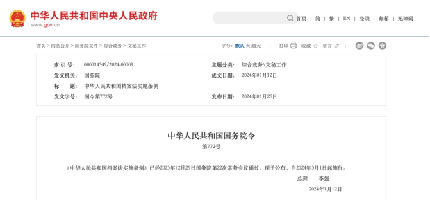 1月25日,國務(wù)院網(wǎng)站公布《中華人民共和國檔案法實施條例》,自2024年3月1日起施行。