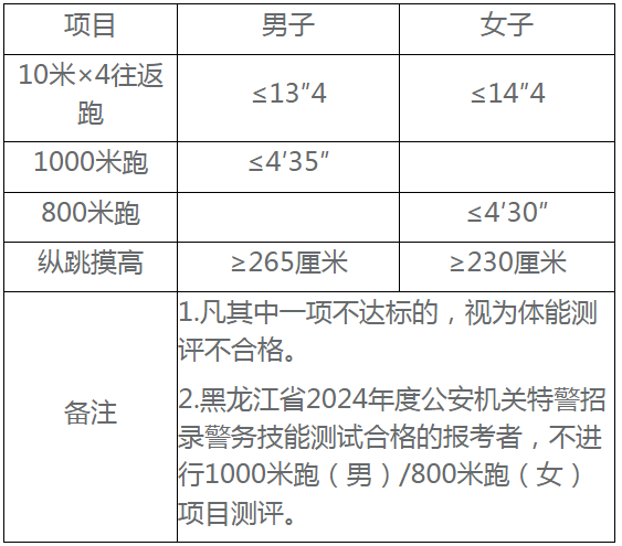 2024年度黑龍江省公務(wù)員錄用考試公檢法司等相關(guān)部門(mén)特殊職位的體能測(cè)評(píng)項(xiàng)目和標(biāo)準(zhǔn)