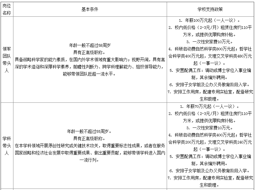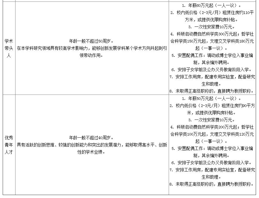 (2)B層次人才:生活補助每年30萬元,連續(xù)發(fā)放5年;一次性購房補助120萬元;科研補助每年自然科學(xué)類100萬元、哲學(xué)社會科學(xué)類30萬元,連續(xù)補助5年。