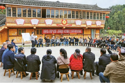 圖為2023年4月6日,貴州省黔東南苗族侗族自治州施秉縣白垛鄉(xiāng)白垛村村民在討論產(chǎn)業(yè)發(fā)展、人居環(huán)境提升、鄉(xiāng)村文明建設(shè)相關(guān)事宜。人民圖片磨桂賓/攝
