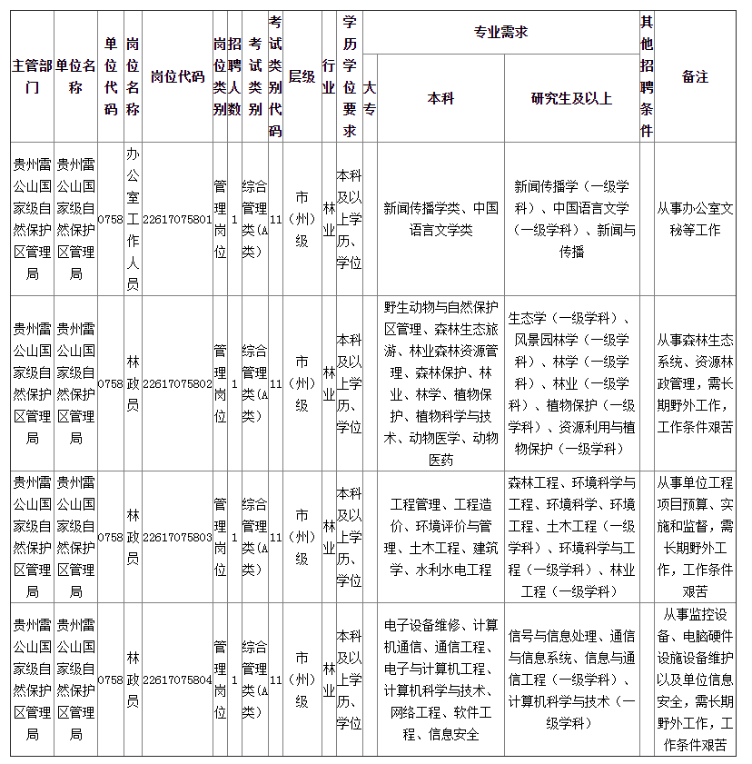 一、貴州雷公山國家級自然保護區(qū)管理局(招聘崗位代碼:22617075801、22617075802、22617075803、22617075804)崗位專業(yè)需求調(diào)整為:
