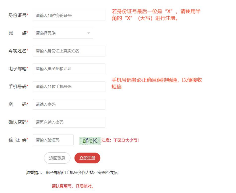 同一身份證號僅允許注冊一次,請勿重復(fù)注冊。應(yīng)準(zhǔn)確輸入身份證號、姓名、民族,保證注冊信息和本人身份證信息相符。用戶名(身份證號)和密碼要妥善保管,如密碼丟失,可使用系統(tǒng)提供方式找回密碼。用戶名(身份證號)和密碼如被他人盜用責(zé)任自負(fù)。
