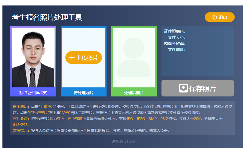 單擊“上傳照片”按鈕,選擇照片源文件,當(dāng)“處理后照片”框中顯示照片后,點(diǎn)擊“保存照片”,選擇“存放路徑”保存審核通過的照片,默認(rèn)文件名為“報名照片.jpg”,點(diǎn)擊“退出”。