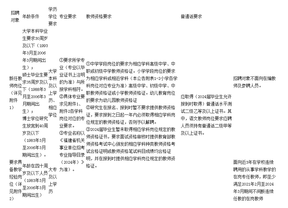 5.專業(yè)條件設(shè)置為“××類”的招聘崗位,符合《福建省機關(guān)事業(yè)單位招考專業(yè)指導(dǎo)目錄(2024年》中“××類”所列專業(yè)的報考者準予報考;專業(yè)條件設(shè)置為具體專業(yè)名稱的招聘崗位,符合所列專業(yè)(詳見本公告附表1、附表2、附表3崗位)的報考者準予報考。對博士和留學(xué)人員的專業(yè)要求按相近原則認定。