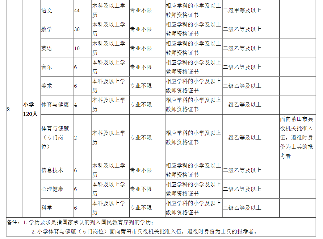 為進一步優(yōu)化我縣教師隊伍結(jié)構(gòu),推進新課程改革,促進教育均衡發(fā)展,根據(jù)省教育廳、省委編辦、省財政廳、省人社廳《關于進一步做好全省中小學幼兒園教師補充工作的若干措施》(閩教規(guī)〔2022〕3號)、省教育廳、省人社廳《關于2024年全省中小學幼兒園教師公開招聘筆試服務工作的通知》(閩教師〔2024〕2號)和莆田市退役軍人事務局、莆田市教育局、莆田市人力資源和社會保障局《關于轉(zhuǎn)發(fā)《福建省促進優(yōu)秀退役軍人到中小學任教九條措施》的通知》(莆退役軍人局〔2023〕49號)精神,結(jié)合我縣教師隊伍實際情況,現(xiàn)制定2024年中小學教師公開招聘方案公告如下: