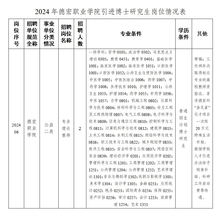 德宏職業(yè)學院公開引進博士研究生2名,具體招聘崗位計劃詳見《2024年德宏職業(yè)學院引進博士研究生崗位情況表》。