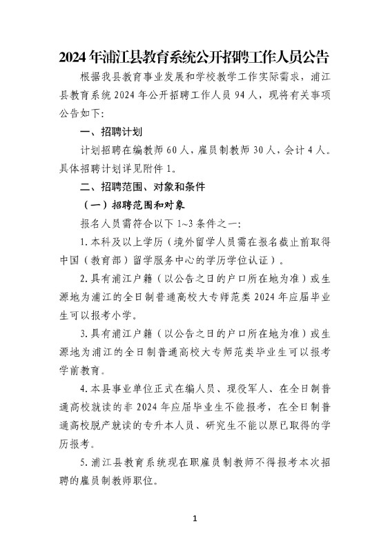2024年浙江金華浦江縣教育系統(tǒng)招聘94人公告