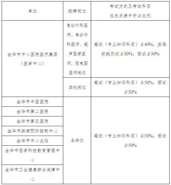 各招聘單位依據(jù)各崗位實(shí)際情況采取不同考試方式,并以規(guī)定權(quán)重計(jì)入總成績,成績均采用百分制。面試成績低于60分者;金華市中心醫(yī)院醫(yī)療集團(tuán)(醫(yī)學(xué)中心)各崗位總成績低于65分者,其他單位各崗位總成績低于60分者,不列入體檢、考察對象。具體權(quán)重如下: