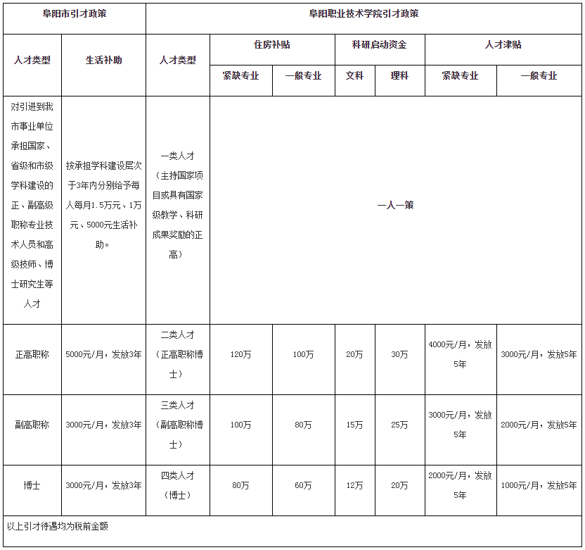 對于引進的高層次人才,按照阜陽市和學(xué)校引才政策提供住房補貼、科研啟動費、人才津貼、生活補助等,具體見表2。