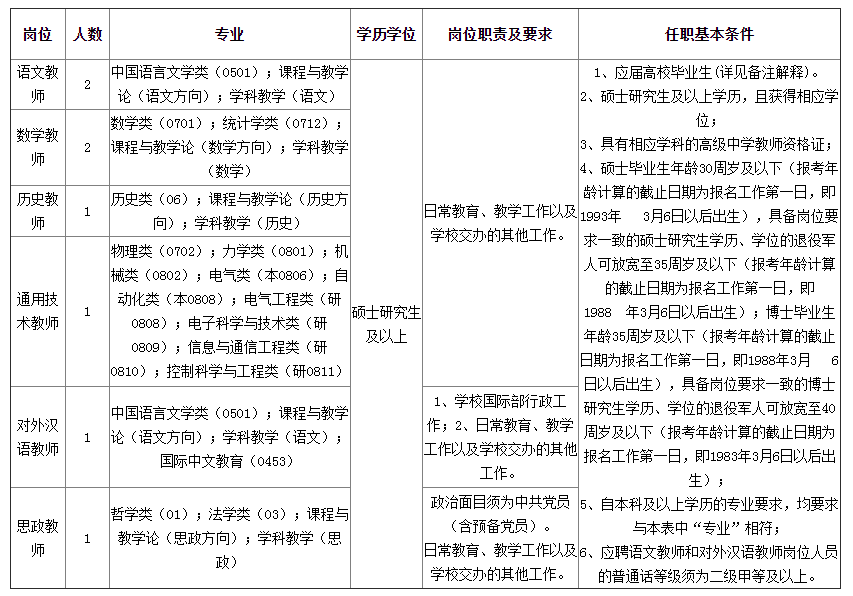 我校2024年擬招聘教師8名,其中語文2名,數(shù)學(xué)2名,歷史1名,思政1名,對外漢語1名,通用技術(shù)1名。(見《2024年天津市南開中學(xué)教師崗位招聘計(jì)劃表》。)