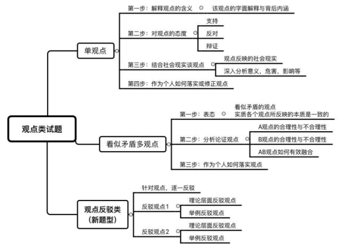 綜合分析類——分析評論兩個或兩個以上看似矛盾的觀點思路:(1)兩種觀點都有一定道理,要全面看待。(2)A的積極性或合理性;B的積極性或合理性;(3)因此,我認為,我們應當把A和B結合起來,在……方面發(fā)揮A的優(yōu)勢,在……方面發(fā)揮B的優(yōu)勢,使相輔相成,相互促進。A與B的矛盾所反映的深層次問題及解決辦法。