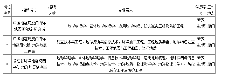 福建省地震局系中國地震局在閩直屬事業(yè)單位,根據(jù)《事業(yè)單位人事管理條例》《事業(yè)單位公開招聘人員暫行規(guī)定》和《中國地震局進人管理辦法》,擬公開招聘博士研究生3名,具體方案如下: