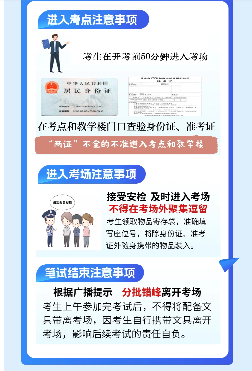 ?。ㄋ模┛忌陂_考前50分鐘須攜帶紙質(zhì)準考證和有效居民身份證原件或臨時居民身份證進入考點,兩證不全者不得進入考點考場。本次筆試公安部門出具的帶有本人照片的“戶籍證明”不視為有效身份證件。